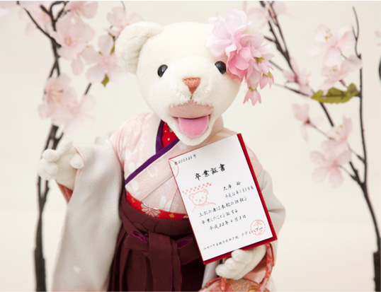 袴姿や髪飾りはもちろん、手に持った卒業証書入れも実物そのままの布張りで仕上げるなど、リアルに再現されたテディベア。「いたずらっぽい笑い方も、なんとなく娘に似せて作りました。」
