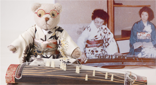 テディベアの後ろ、左手に写っている慎ましやかなご夫人が、若かりし日の平口さんのお母様。クマと同じ着物を着てお琴を弾いているのがわかります。