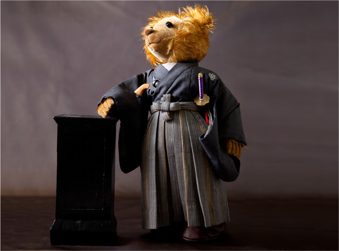 歴史上の人物やその方にまつわるエピソードに刺激を受けると、作品として再現したくなります。幕末や戦国時代など、日本の運命がガラリと変わるような激動の時代に惹かれることが多く、ドキュメンタリーやドラマ番組を見たり、本を読むなどして見識を深めています。そこで得た知識を、可能な限り反映していくのが楽しいですね。この坂本龍馬クマさんは、とことんリアリティにこだわりました。家紋もそっくりに作りましたし、着物の生地は龍馬さんが着用したとの説もある播州織り。彼の活躍していた場所を知りたくて、長崎の亀山社中も訪ねました。