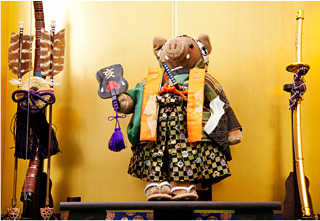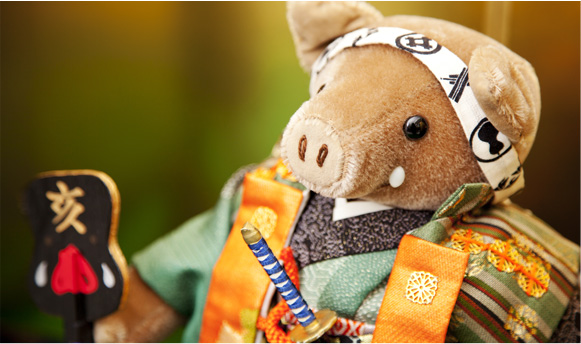 ユーモラスな表情が愛らしいイノシシ。はちまきや刀などの装飾品はもちろん「亥」の文字と紋入りの軍配まで、平口さんらしい細工と遊び心がたっぷり。