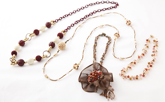 シフォンや布などの素材も取り入れたエレガントなアクセサリーはパーティなどでも大活躍。軽いつけごこちで年配の方にもおすすめ。