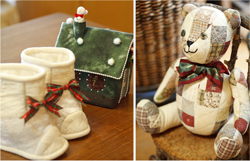 パッチワークキルトの技術を活かして、立体的な作品に応用。温かなベロア生地や、清楚なホワイトの生地を使えば、ノーブルで上品な仕上がりに。