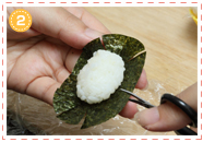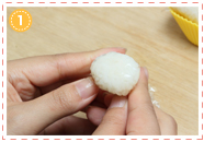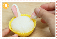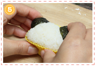 3でつくったおにぎりを半分にカットして、クマと同様にして丸めの三角に握ったおにぎりにつけます。