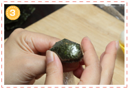 2を再度ラップで包んで、のりを落ち着かせます。ごはんが温かいうちのほうがきれいに仕上がります。
