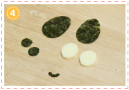 5に4の顔パーツをのせて完成。目の部分は、目のまわりののり、白目チーズ、黒目ののりの順に重ねて。