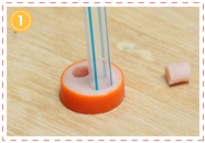 4のスパゲティに3でつくった耳を差し込んで固定します。耳が下がってこないよう、カップの縁にのせるように。