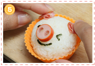 4を顔のおにぎりの頭の部分につけ、ほっぺにケチャップで色づけをしたら完成です。