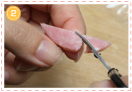 半分に折ったハムの端を切り取り、2枚重ねたままハサミで細長いしずく型に切ります。