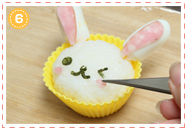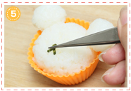 4の顔パーツをおにぎりにのせます。顔の中心になる口や鼻からおくとバランスがとりやすいです。