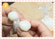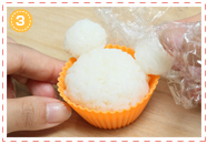 耳2つ分をつくる量のごはんをまとめてラップに包み、2等分しながら丸く握ります。