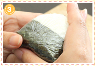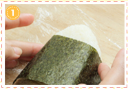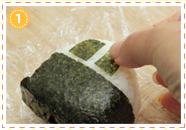おにぎりを裏返し、のりに切り込みを入れて裏側にも巻きつけます。