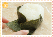 塩で味を調えたごはんをラップで三角形ににぎり、下半分にのりを巻きます。