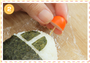 おにぎりに顔のパーツをのせていきます。まずは鼻・口の部分をまん中に置きます。