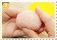 ごはんにピンク色のふりかけを混ぜ、シリコンカップより少し小さめになる分量をラップに包みます。