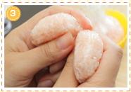 うさぎの耳に使うごはんをラップに包み、2等分してそれぞれ細長くにぎり、耳の形をつくります。