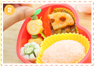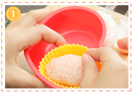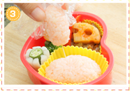 ラップから取り出したごはんをシリコンカップに入れ、お弁当箱にセットします。