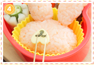 目の部分をのせ、仕上げに、竹串にケチャップをつけてほっぺを描きます。