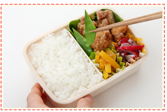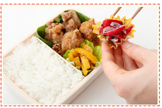 ごはんはお弁当箱の約2分の1、主菜と副菜がそれぞれ約4分の1の分量となるのがお弁当の基本のバランス!