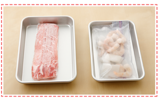 冷凍した肉やシーフードなどの食材は、前日夜から冷蔵庫に移して解凍します。食材は1食分ずつ冷凍しておくと調理しやすい。